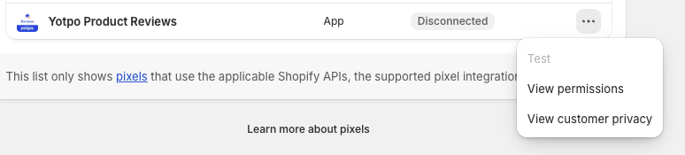 Shopify App Embeds work similarly to the Shopify Pixels but there is no way to verify that they are respecting consent through the Shopify platform or ours. If you look at the "Customer Events" page in your Shopify store then click the [...] to the right of one of the App Embeds you will notice that "Test" is greyed out.