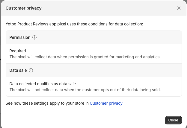 However they do have a "View customer privacy" link which you can click to see the permissions that the app developer has indicated are required for the App Embed to run. This takes you to a modal which shows you the permissions for the App Embed